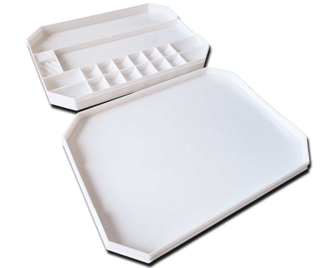 Measuring 6.7" * 9.25" * 1.6", this palette is easily transportable, and perfect for any sized painting station! Each Wet Palette also comes with 50 Hydro sheets, 2 Sponge Pads, and an elastic keeper for transport.